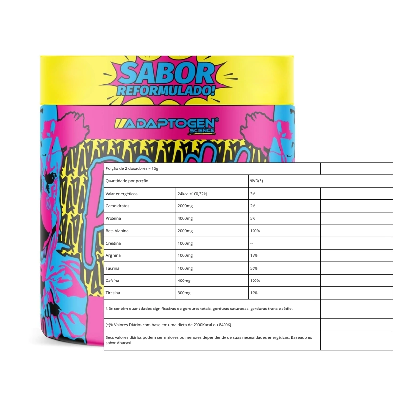 Maltodextrina, Beta Alanina, Creatina, Arginina, Taurina, Cafeína, Tirosina, Ácido Cítrico, Fosfato Tricalcico, aroma idêntico ao natural de abacaxi, aroma de mascarante, edulcorante sucralose, corantes amarelo 5.